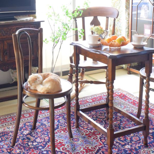 最近、朝晩が冷え込むようになったので、畳の上にペルシャ絨毯を広げた和室のコーディネートを。 一番、良く使うこと間違いなし!と自信を持っておすすめするツイスト足のオケージョナルテーブルにベントウッドチェアを組み合わせたお部屋。窓際にロッキングチェアを置いて、ゆらゆら揺られながらお昼寝したい気分。 ここしばらく忙しかったので、久しぶりにゆっくりリフレッシュ出来て力が蓄えられたので、また明日から頑張れそうです!