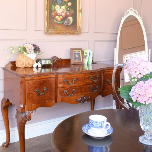 こんな部屋に住みたいな・・・と思いながら、憧れをギュッと詰め込んだサロンスタイルのティーコーナーを作ってみました。 マホガニー材のパーラーキャビネットを置いただけで、お部屋の中が一気にランクアップ☆大好きなヘップルホワイトチェアとセティを組合わせて、お部屋を明るくしてくれるシュバルミラーを。 色やデザインはもちろん、鏡に太陽の光が反射して、ワントーン明るくなったお部屋の中で、ゆったりとお茶を楽しみたい気分デス。