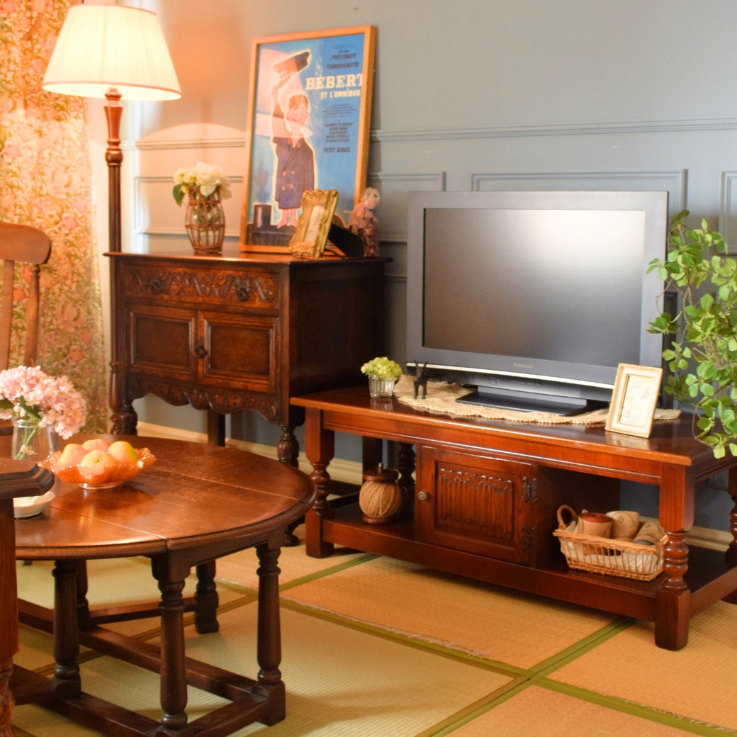 夜、すごく冷え込むようになってきたので、ちょっとコタツが恋しいなと思いながら和室をコーディネートしてみました。 コタツ代わりに、広げると丸くなる伸長式のゲートレッグテーブルを置いて、テレビボードにピッタリだ!と大喜びしながらコーヒーテーブルを設置。 チェスターフィールドの横にボビンレッグのオケージョナルを置いてみたら、高さがピッタリで嬉しい~!ロッキングチェアに座ってゆらゆら揺られながら読書を楽しみたいと思います。