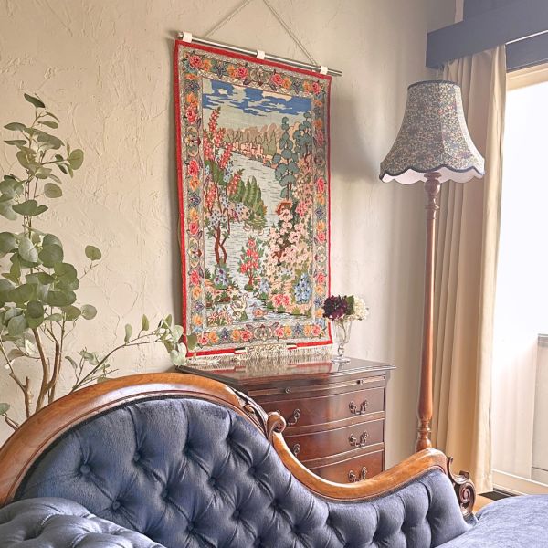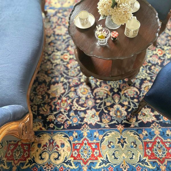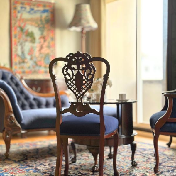 何か月ぶり?と主人と言いながら、久しぶりにどこにも出かけずまったりと過ごす休日。1週間経っても治らない長引く風邪には、無理をせず、ゆっくり体を休めるしかないなと思って、英国上流階級気分でサロンを作ってみました。 一緒なお部屋に置きたい!と思って、同じ生地で貼り替えた、形が違うサロンチェアたちを並べるチャンス☆パーラーと組み合わせると間違いがなく気分が上がる~!! とは言え、この部屋の中で一番の主役は壁に掛けたイスファハーンの絨毯!絵画のように、より美しくお部屋を格上げしてくれます。