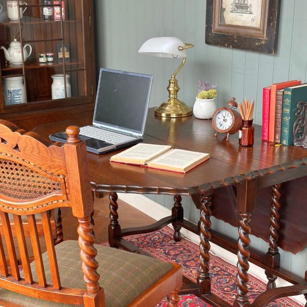 英国アンティークの | ゲートレッグテーブルをデスクにしたチョコレート色の書斎