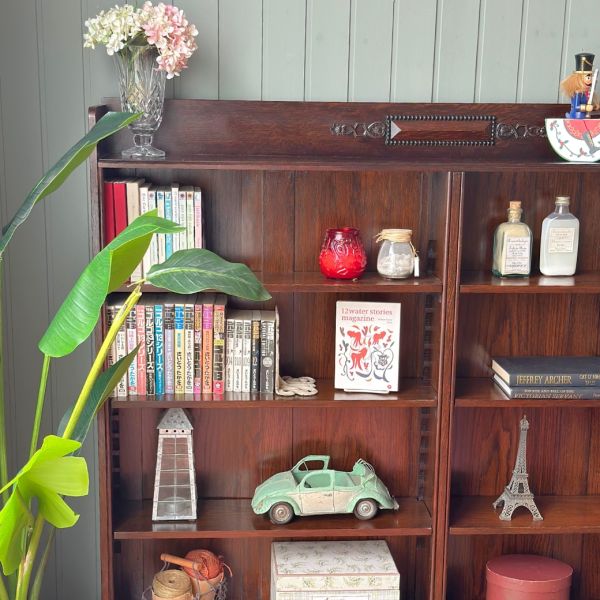 ガラス扉付きとオープンタイプの本棚を置いて、チョコレート色の家具でトータルコーディネートしたお部屋はすっごく落ち着いた雰囲気だな・・・って思いながら、アクセントになるように椅子は明るい茶色をセレクトしました。