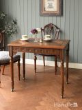 天板のパーケットリーが美しいおしゃれなテーブル、足先にキャスターが付いたアンティークテーブル