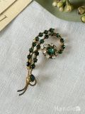 深いグリーン色の美しいお花のブローチ、ラインストーンのビンテージアクセサリー