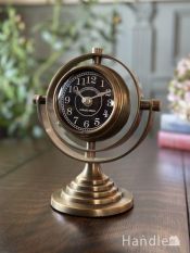 方位磁石がデザインされたアンティーク調の時計、ブロンズ色に輝く球型のおしゃれなクロック
