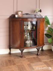 華やかな杢目のアンティークサイドボード、ハーフムーン型の美しいガラスキャビネット