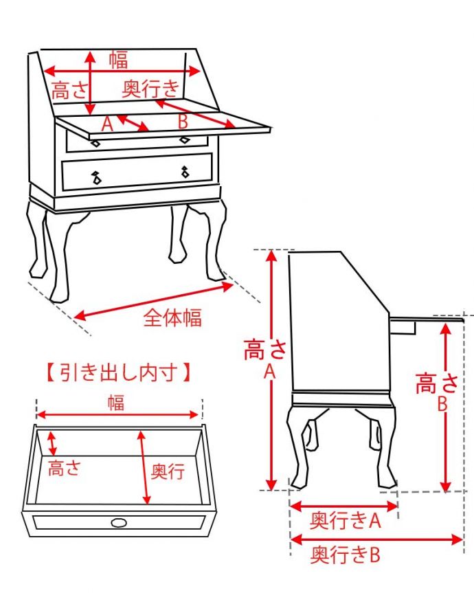 ビューローの引き出しの中 - 引き出しの中も、専門の職人がキレイに修復したので何を入れてもOK。実用的にいろいろ収納して使って下さい。