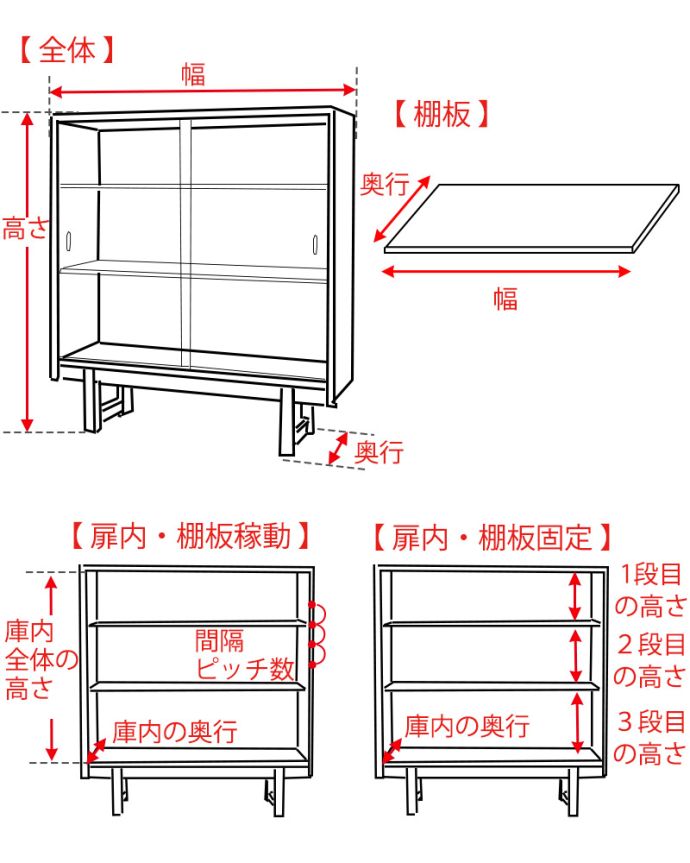 【 上扉内 】左右: 幅66×奥行き24×高さ47cm 【 棚板 】高さ調整可能 奥行き23cm 【 下扉内 】幅134×奥行き24×高さ30cm |