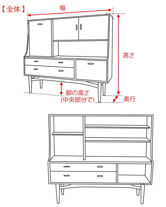 【 上段左右扉内 】 幅43×奥行き25×高さ88cm 【 棚板 】高さ調整可能 奥行き22cm 【 上段中央棚内 】 幅59×奥行き26×高さ28cm 【 上段中央オープン棚内 】 幅63×奥行き28×高さ61cm 【 棚板 】高さ調整可能 奥行き25cm 【 下段左右扉内 】 幅43×奥行き40×高さ57cm 【 棚板 】高さ調整可能 奥行き35cm 【 引き出し 】 (1段目)幅60×奥行き37×高さ16cm (2段目)幅60×奥行き37×高さ16cm (3段目)幅60×奥行き37×高さ16cm |