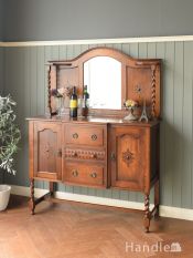 - ツイストの支柱がとっても美しいアンティークの家具、英国アンティークの鏡がついたミラーバックサイドボード (h-175-f)