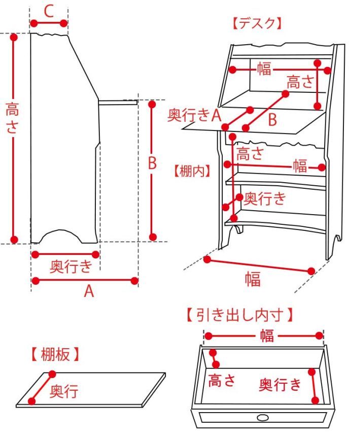 A:53cm B:75cm C:30cm 【 デスク 】 幅47×奥行きA:28 B:52×高さ31cm 【 引き出し 】 幅45×奥行き21×高さ6cm 【 棚内 】 幅47×奥行き25×高さ50cm 【 棚板 】固定 奥行き25cm 高さ(1段目)22cm (2段目)27cm |
