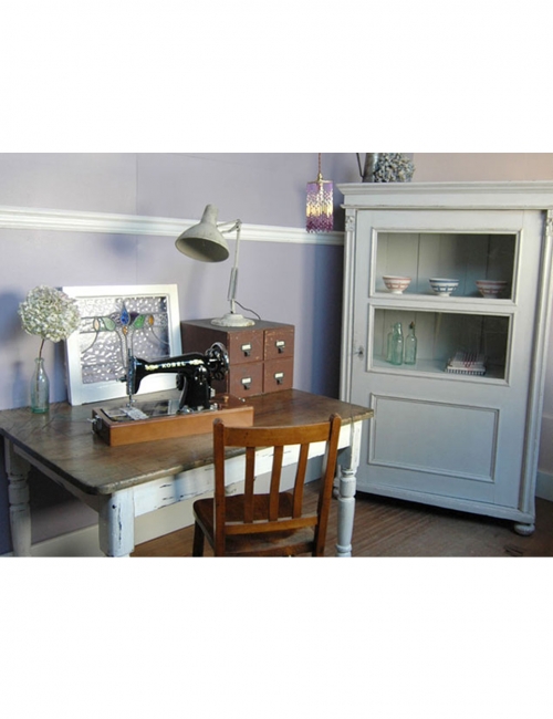 脚が白くペイントしてあるダイニングテーブルに、キッチンチェアを合わせてワークスペースに。