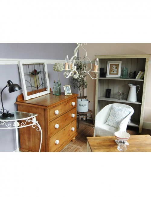 アンティークパインのチェストの上にステンドグラスをディスプレイして、色を添えてみました。