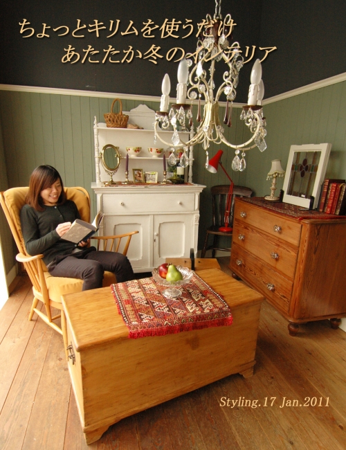 上にはキリムを敷いて、ステンドや本を置いてみました。