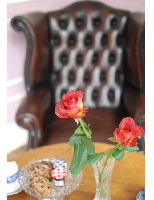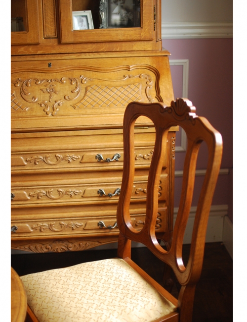 ビューローのデザインに負けないように隣にはウィングバックチェアを。とっても相性がいいんです。