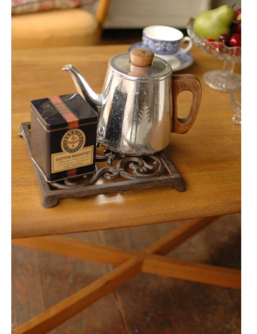 センターテーブルは北欧を思わせるシンプルなデザインのものを。 お茶のセットも今回は北欧調でシンプルに。