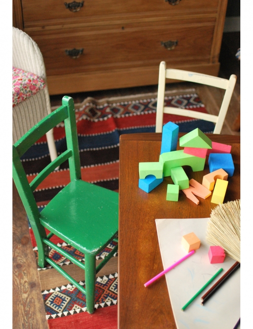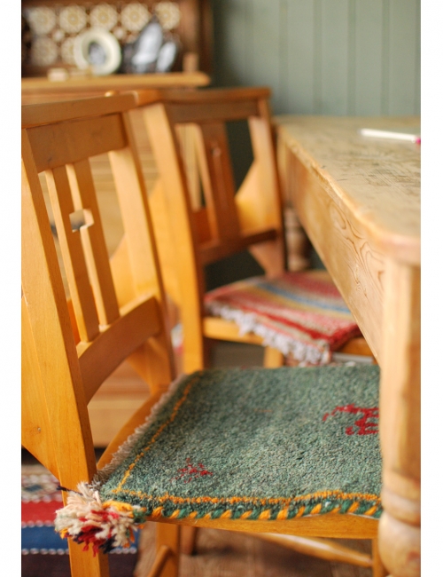 チャーチチェアはキッズルームにピッタリ。 ギャッベを乗せるだけで素敵なクッションに早代わり。