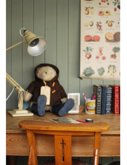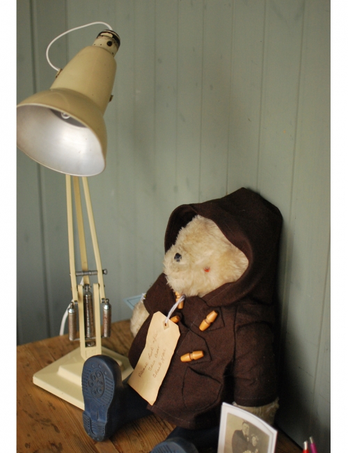 アングルポイズを使ってお勉強。アンティークのパディントンが見守ってくれます。