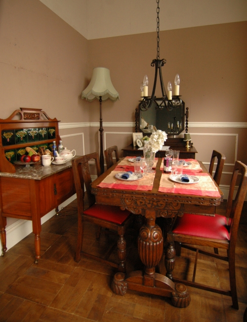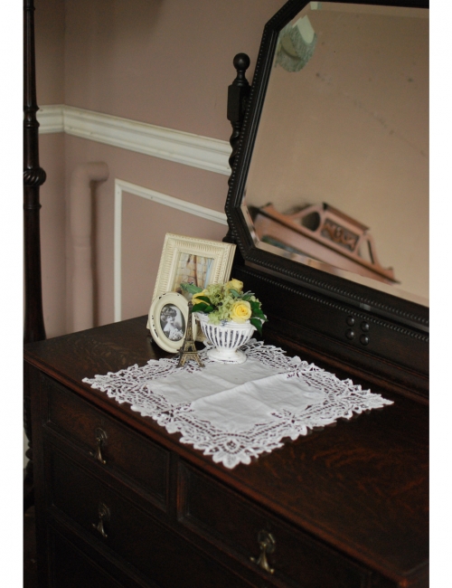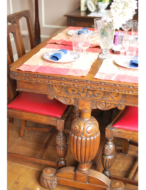 こちらはお花咲いているテーブル。よく見ると、天板の横と脚の部分にお花の彫がいっぱいです。