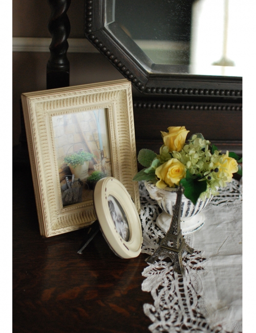家具の色が濃いので、白いフォトスタンドを合わせてみました。