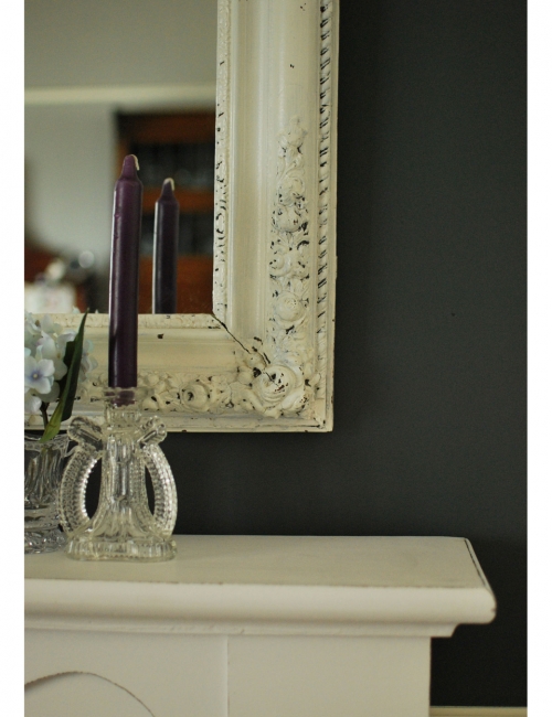 マントルピースの上には、プレスドグラスや写真立てを並べて。