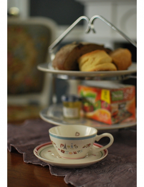 コーヒーテーブルの上にはコントワールドファミーユの新作カップ&ソーサー。