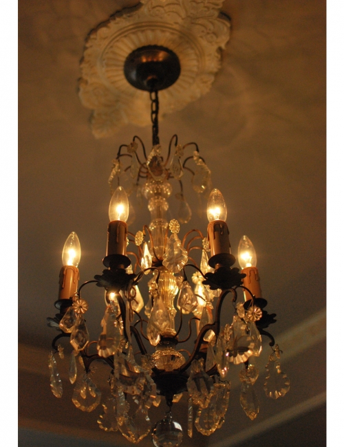 ガラスコラムが入ったシャンデリアは、アンティークならでは。