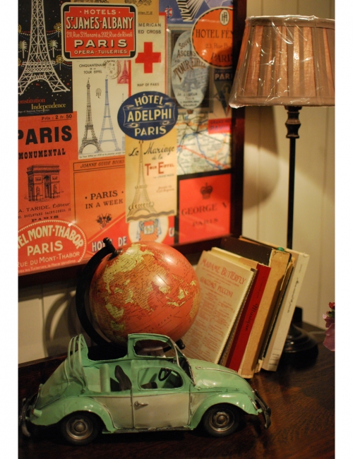 オーク材のチェストの上には、テーブルスタンドとグローブ。
