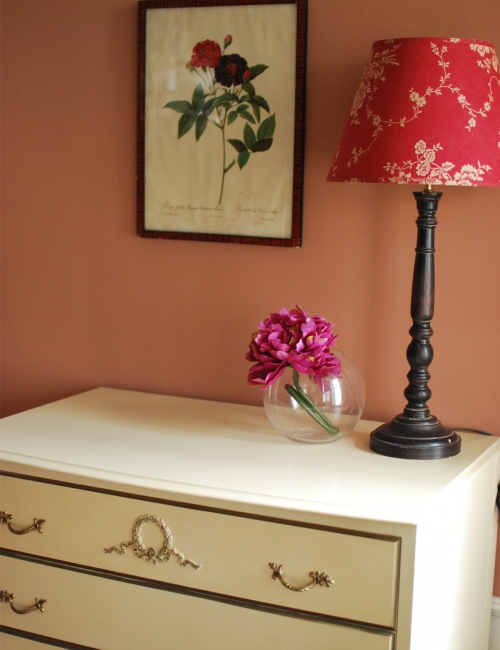 可愛いチェストの上には、ソファとお揃いの生地のテーブルランプ。赤が可愛い。