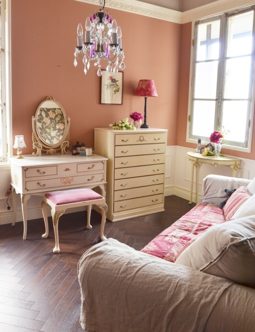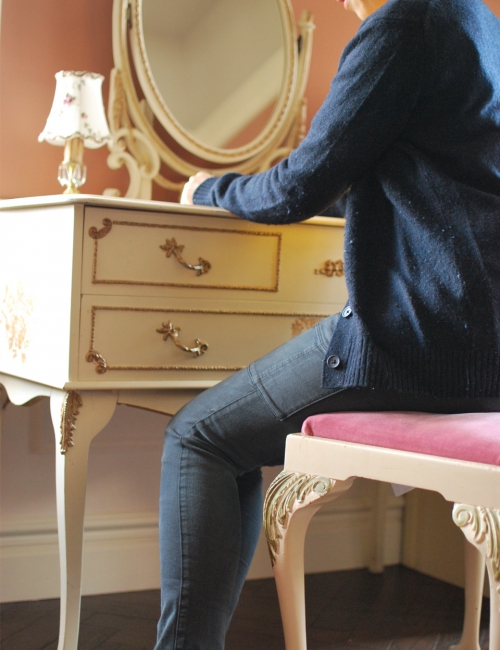 ここに座るだけで夢を見てしまうドレッサー。スツールの座面もピンクで。
