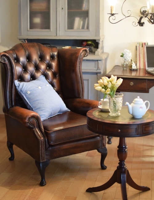 大人の部屋には、やっぱりカッコいいウィングバックチェア。前にはドラムテーブルを置いて。