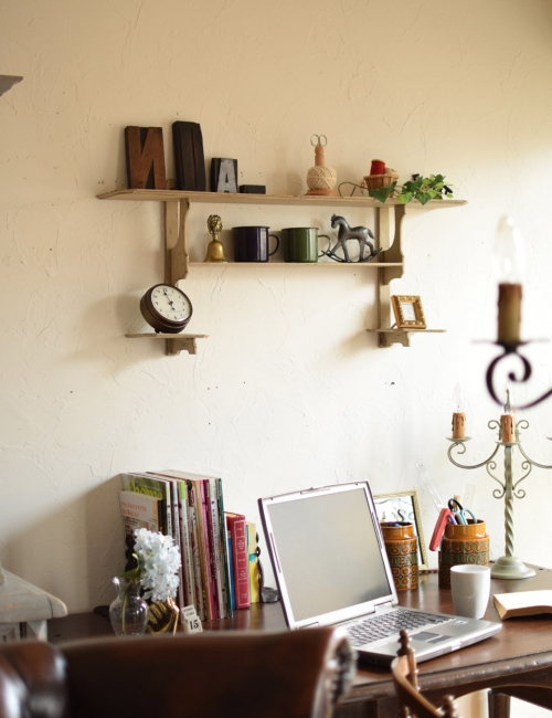 デスクの壁が寂しいから、シェルフを付けて可愛くディスプレイ。