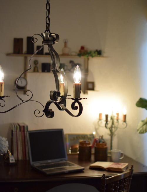 アイアンのシャンデリアとテーブルシャンデリア。灯りのマジックで大人空間。