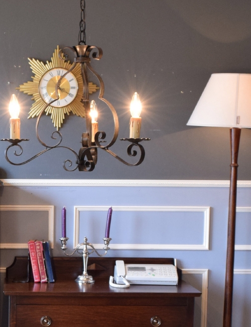 曲線が女性らしいアイアンのシャンデリアとフロアランプをプラスして。このスタイルにはよく似合います。