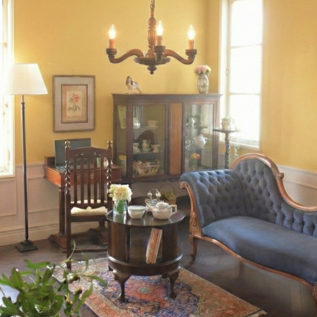 前にドラムテーブルとサロンチェアを置くだけで、もう何もいらない完璧空間が出来上がり!