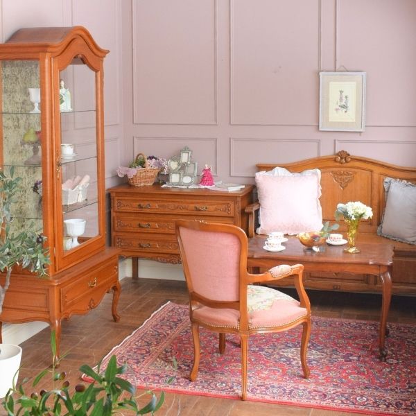 主役はピンクのプチポワン。可愛い雰囲気そのままに壁にフランスのウォールハンガーを取り付けてホワットノットでさらにゴージャスに。