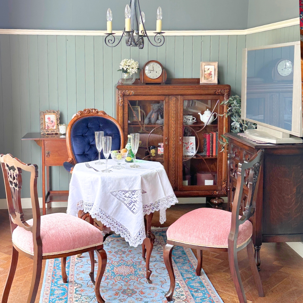 お部屋の角にコーナー用のコンソールテーブルとベンチ付きのステッキスタンドを置いて、光をたっぷり取り込むガラスキャビネットを眺めながら、夜が来るのを待っています。