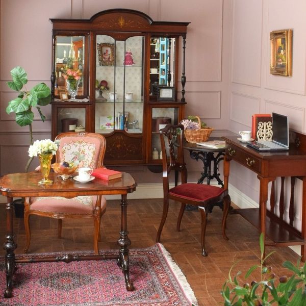ゆったりくつろぐための椅子は、マホガニー材のサロンチェア。クラシックスタイルのアンティーク家具の中でスミスの時計が刻む時間を見ながら、疲れを癒しています。