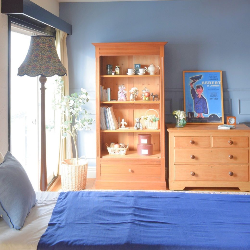 主人が現地で買い付けてきたオールドパインの家具がすごく可愛かったので、組み合わせて作ったナチュラルスタイルの寝室。メインカラーはピンクだなと思いながら、ロイドルームを合わせて、フランスの赤いクッションで彩ってみました。