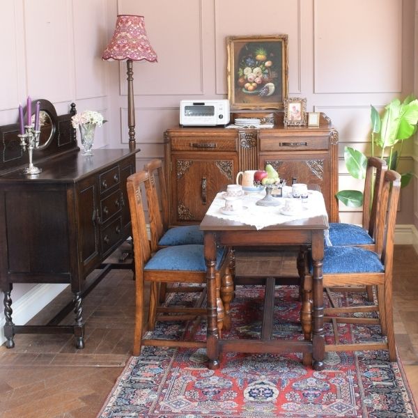 実は広げ方がいつもと違う、バルボスレッグのダイニングテーブル。ツイストの椅子を組み合わせて、分かりやすい英国アンティークスタイルのダイニングに仕上げてみました。