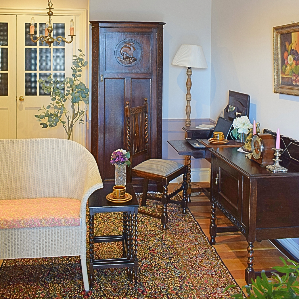 今日の気分はエレガント(笑)木目が美しいレディデスクを主役に、バルーンバックチェアと組み合わせたデスクコーナー。テーパードレッグが美しいガラスキャビネットと組み合わせてみたら、すっごく上品!