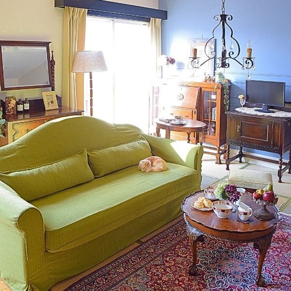 実は、一番のお気に入りはマホガニーの丸いコーヒーテーブル。絶妙な高さと美しい木目を見ながら大絶賛!この子を選んだ私を褒めてあげたい~(大笑)