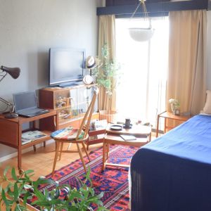 ベッドに寝ころびながら、ほとんど見ることがないテレビが見れるようにガラスキャビネットの上に置いて、PCデスク代わりに移動式のワゴンを。天板が大きくなるのですごく便利そう!