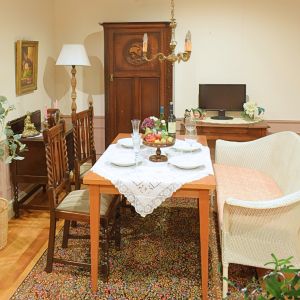 大きなワードローブを食器棚に使う、英国スタイルのダイニング