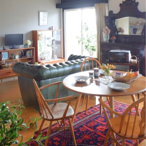 ダイニングには、アーコールのテーブルセットを。リビングにはチェスターフィールドのソファを置いて。