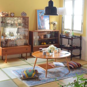 ホットカーペットの上にペルシャ絨毯を敷いて、足元からじんわり温まる和室。 そこに、直線がきれいな北欧スタイルのヴィンテージキャビネットと、大きなちゃぶ台代わりのローテーブルを置けば、寒い季節のレッスン帰りもワクワクする!