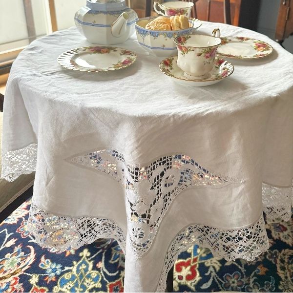 フランスのアンティーククロス、繊細なカットワークのおしゃれなテーブルクロス (m-7118-z)