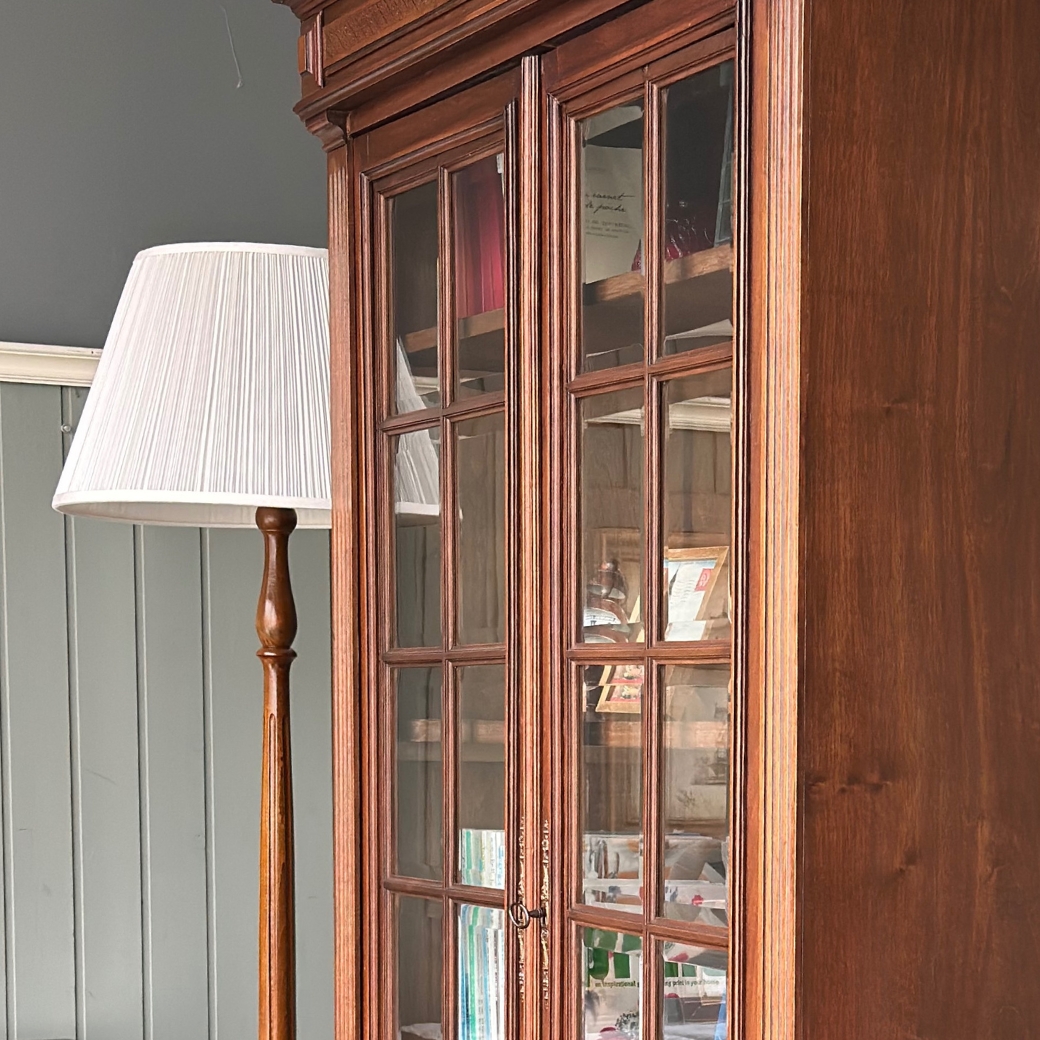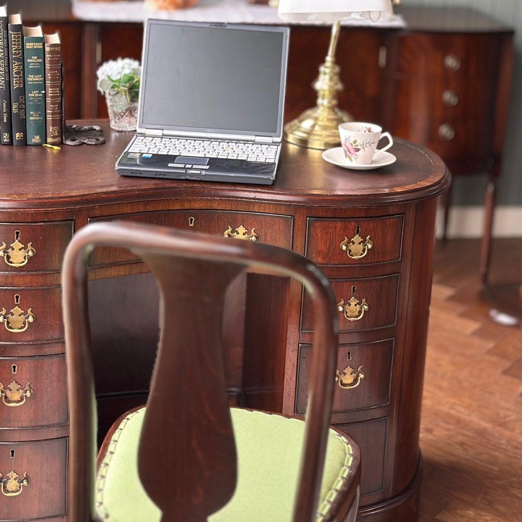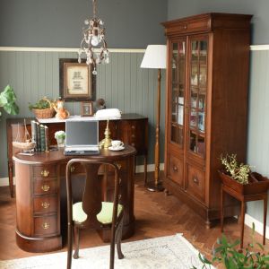 間仕切りに使える、とってもめずらしいキドニー型のプレジデントデスクをお部屋の真ん中にドーンと置いて、これまたすっごくめずらしいクイーンアンスタイルのベントウッドと組み合わせてみました。