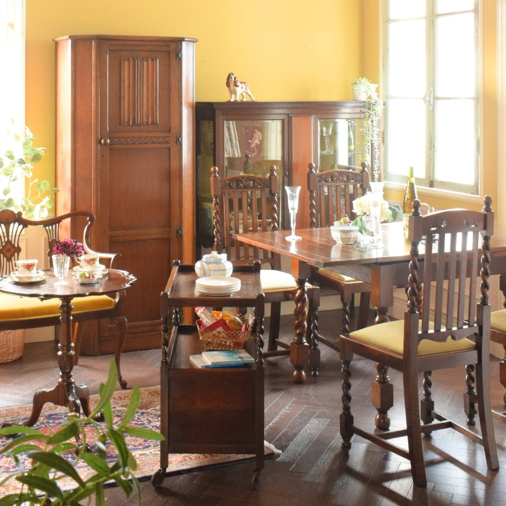脚の装飾が美しいアンティークの伸長式テーブル、イギリスから届いたおしゃれなバルボスレッグのドローリーフ