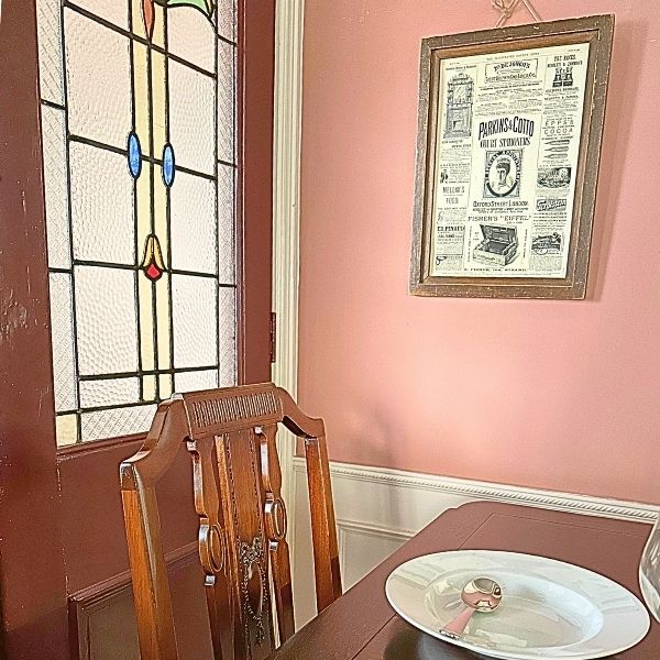リボン模様とパープル色のバラが美しい、アンティークのステンドグラス (g-1425)